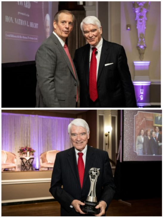 McAtee chronicled Justice Hecht’s remarkable 43-year judicial career—35 years on the Supreme Court of Texas, including more than a decade as Chief Justice—calling him “one of the great legal minds of our time.” He quoted Hecht’s own 2017 testimony before Congress: “If justice were food, too many would be starving; if it were housing, too many would be homeless.” Hecht’s leadership, McAtee added, reflects the grit and humility learned “on a wheat farm in New Mexico, where his parents modeled the words never give up and always go the extra mile.”